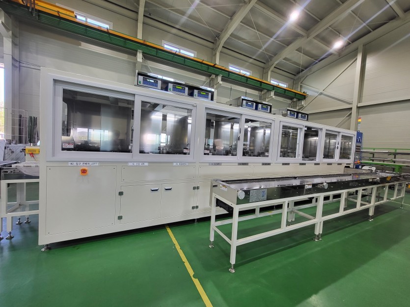 스마트 팩토리용에 도입 가는한 자동 세척기로 초음파세척, 에어컷, 건조의 시스템이 적용됨